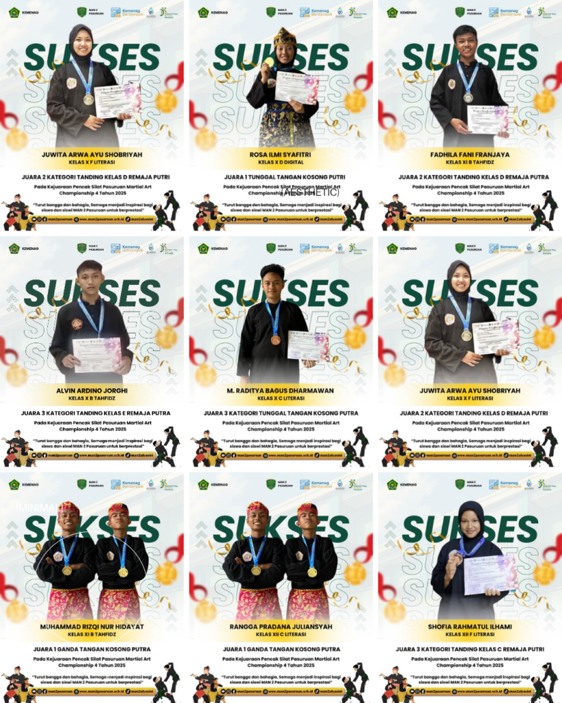 Adapun prestasi yang diraih antara lain Rangga Pradana Juliansyah (XII C – Literasi) dan Muhammad Rizqi Nur Hidayat (XI B – Tahfidz) yang masing-masing meraih Juara 1 Ganda Tangan Kosong Putra. Sementara itu, M. Raditya Bagus Dharmawan (X C – Literasi) meraih Juara 3 Kategori Tunggal Tangan Kosong Putra.