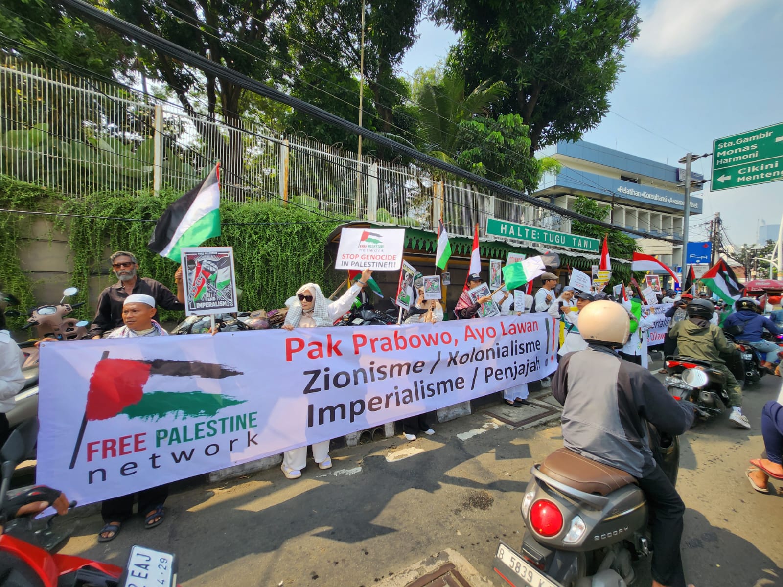 Aksi ini bertepatan dengan perayaan HUT ke-80 TNI. Massa membentangkan spanduk bertuliskan seruan agar Presiden Prabowo Subianto tegas melawan zionisme, kolonialisme, dan imperialisme.