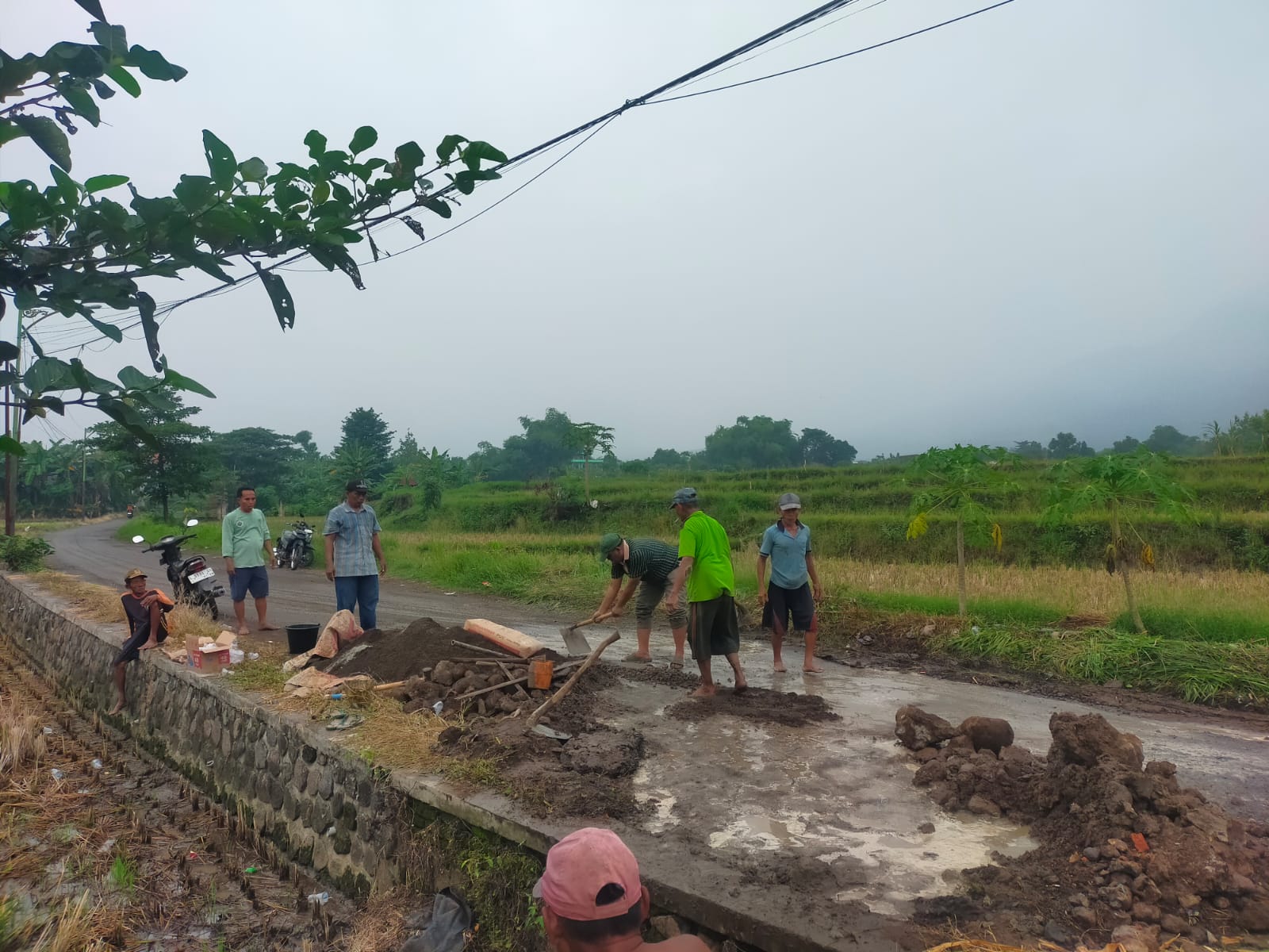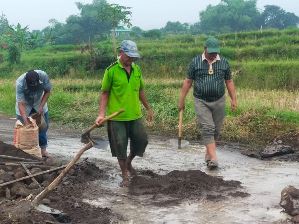 “Luas lahan yang bergantung pada aliran irigasi ini sekitar 5 hektare. Para petani tidak bisa menggarap sawah karena gorong-gorong yang melintas di jalan desa ambrol. Sudah diusulkan, tapi belum ada realisasi, jadi kami terpaksa gotong royong,” ujarnya.