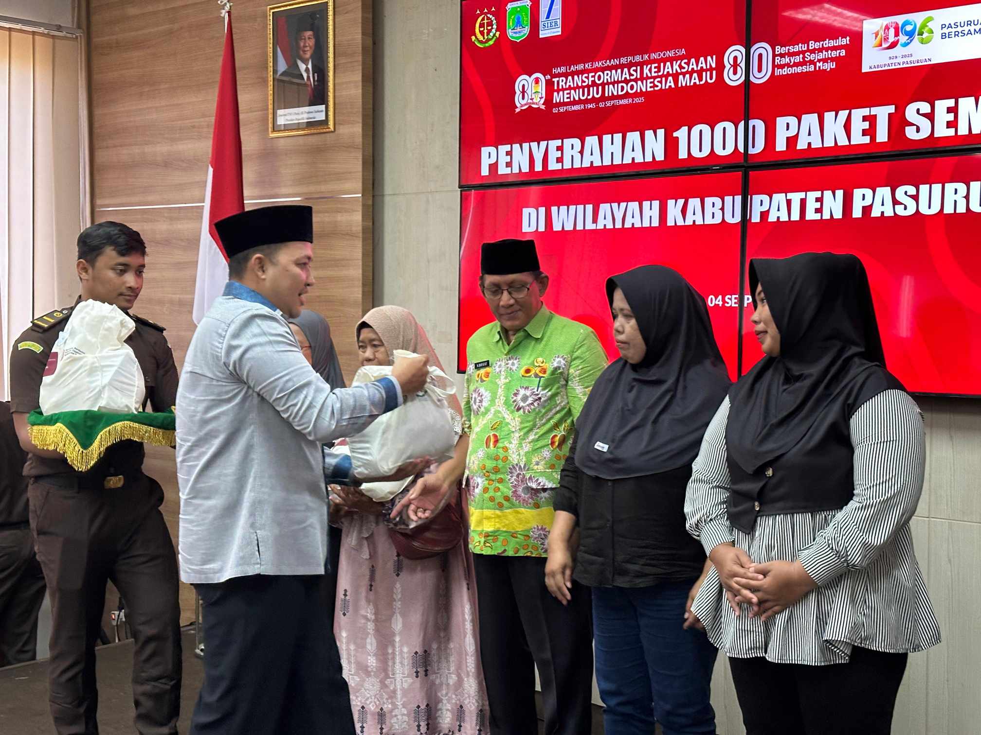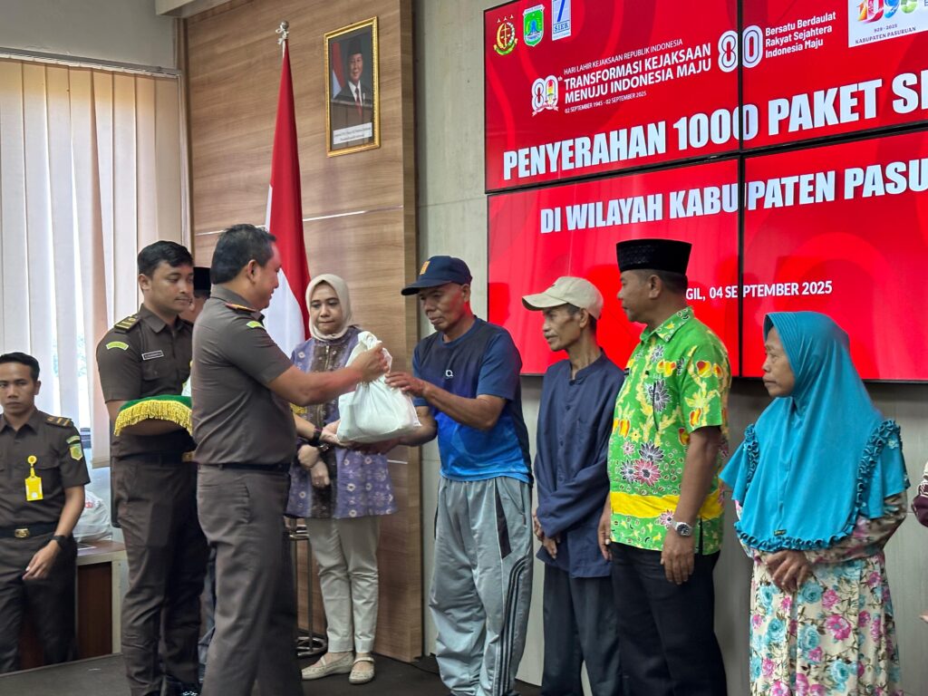 PASURUAN, DIALOGMASA.com – Dalam rangka memperingati Hari Lahir Kejaksaan Republik Indonesia ke-80, Kejaksaan Negeri (Kejari) Kabupaten Pasuruan menyalurkan 1.000 paket sembako bagi warga kurang mampu, Kamis (4/9/2025).