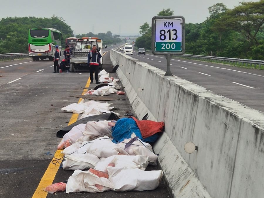 “Pikap bermuatan daging ayam mengalami pecah ban belakang, pengemudi kehilangan kendali, kemudian menabrak pembatas jalan hingga kendaraan terbalik,” ujar Ipda Firman.