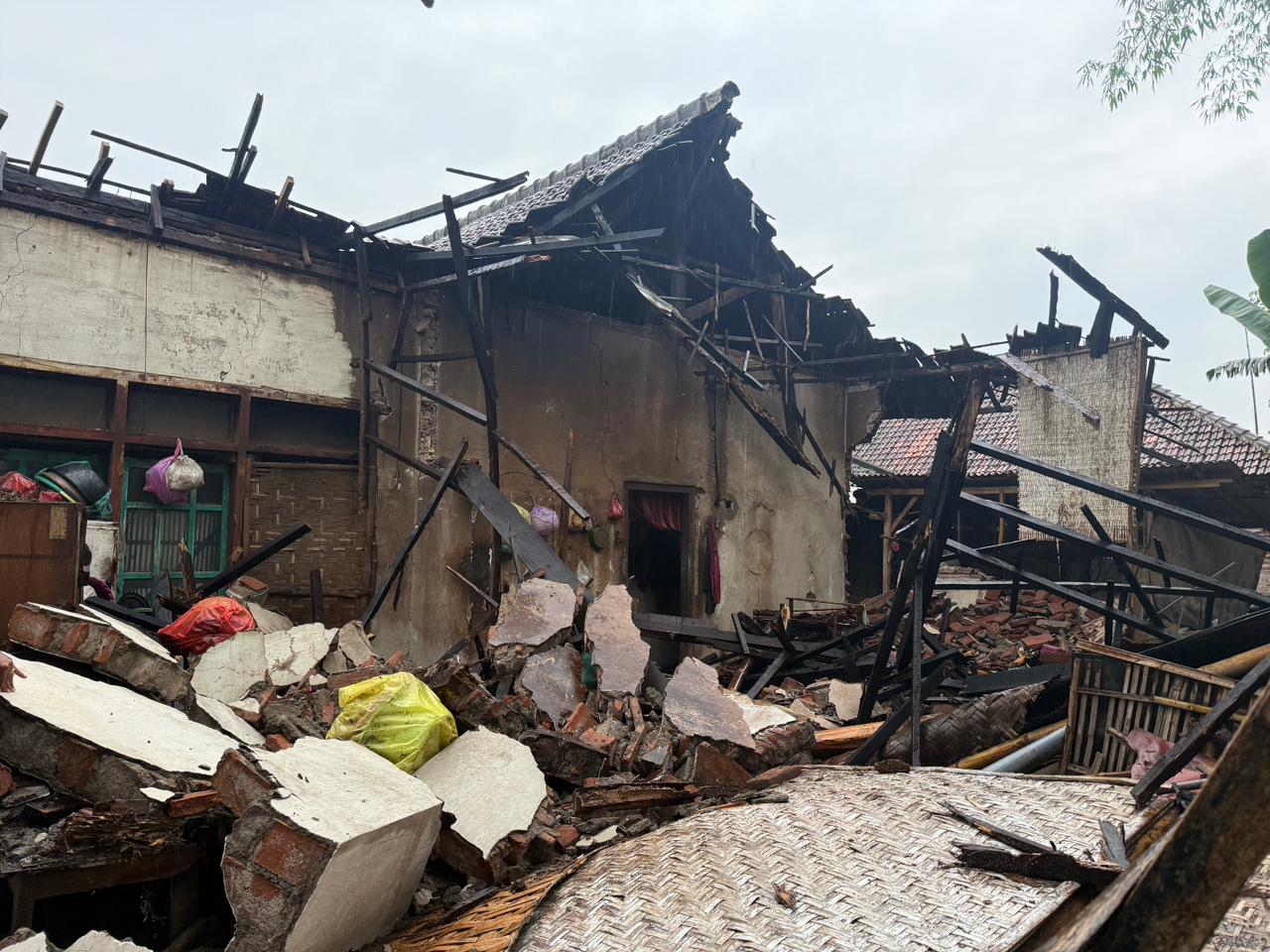 Rumah tersebut diketahui milik Aisah (63), warga yang tinggal seorang diri di dusun setempat. Bangunan mengalami kerusakan parah pada bagian atap dan dinding setelah angin kencang disertai hujan melanda wilayah tersebut.