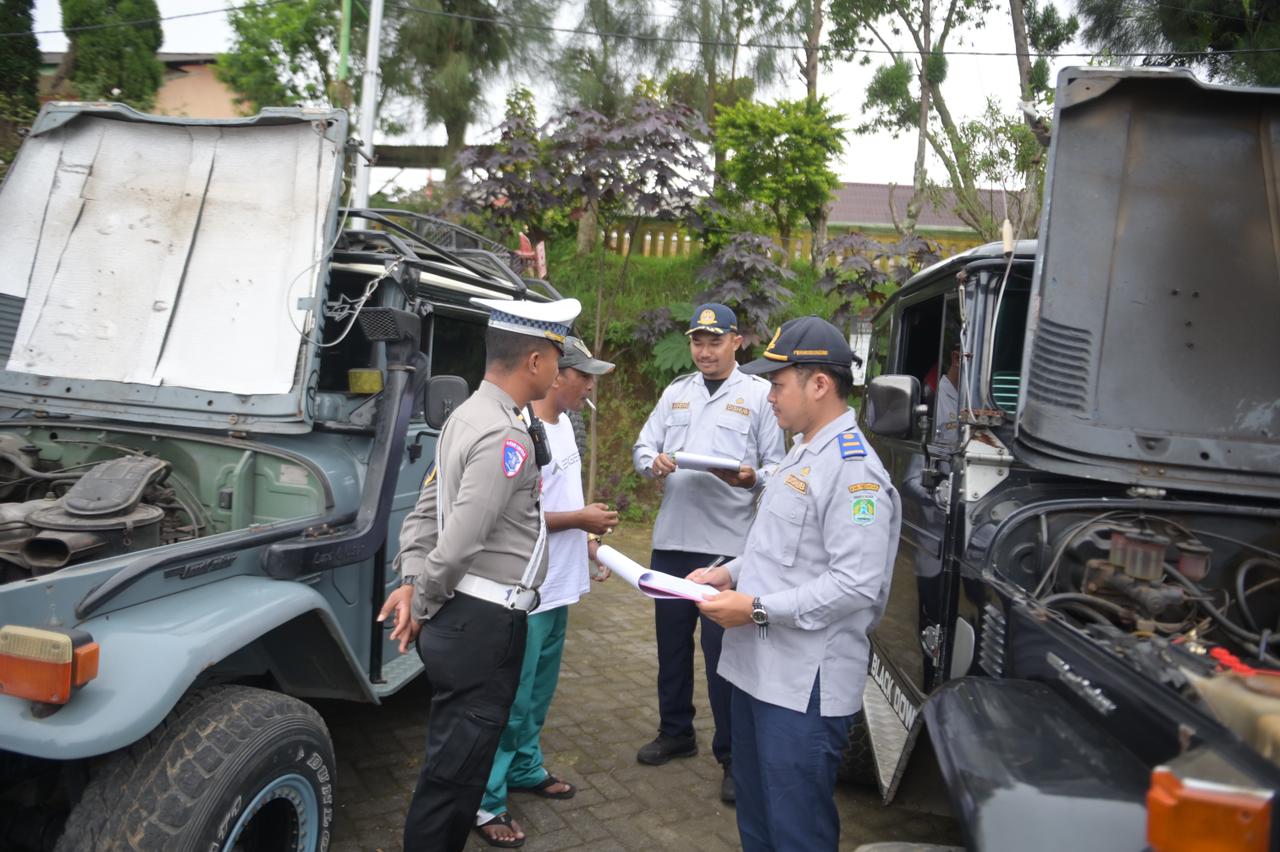 Sebanyak 35 unit jeep milik komunitas Jeep Bran Kulon, Desa Tosari, dicek satu per satu. Pemeriksaan meliputi kondisi mesin, sistem pengereman, lampu, ban, hingga kelengkapan standar pengamanan bagi penumpang.
